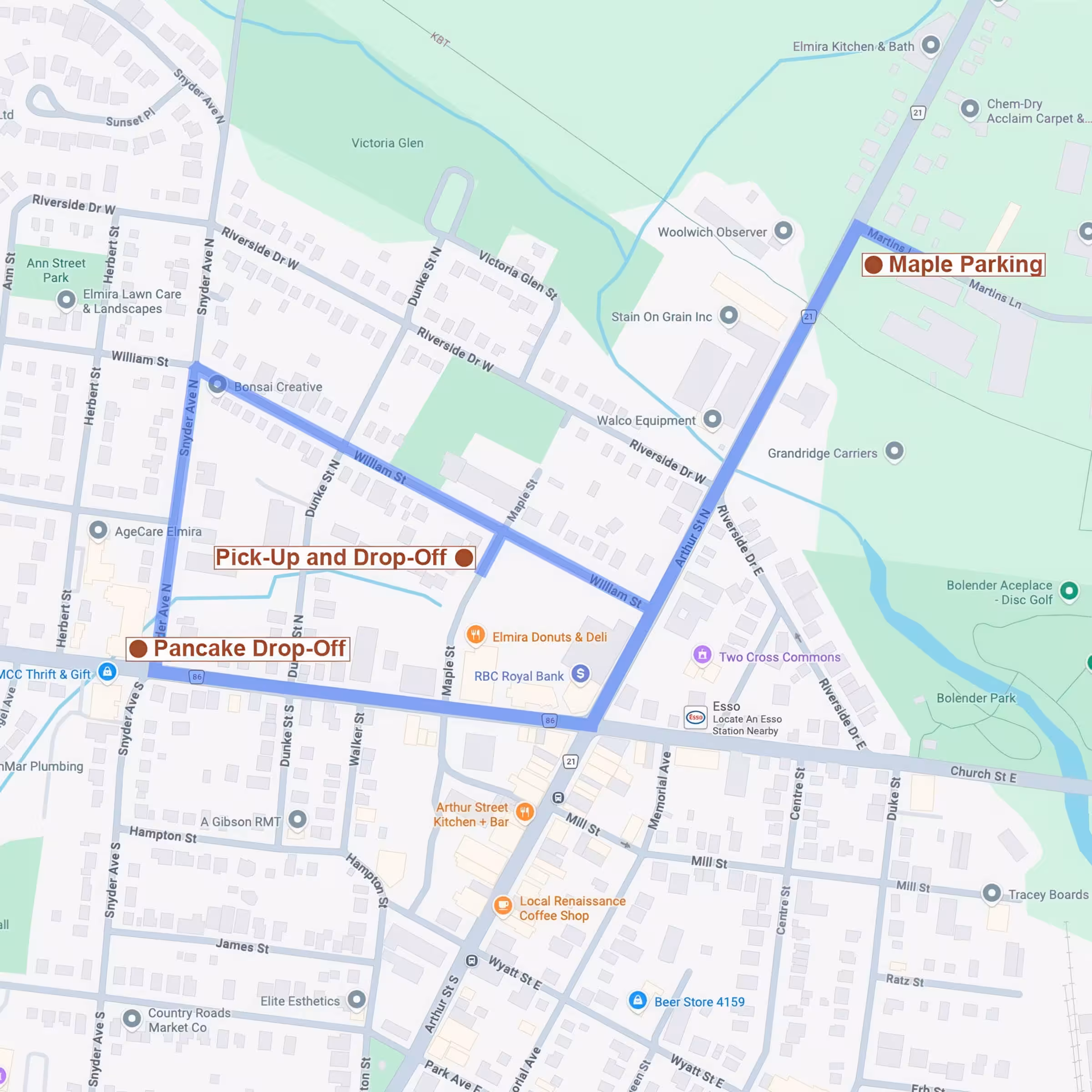 If you are coming into Elmira from the north, east, or west you will be directed to park in the Maple lots. This map shows the route that the wagons will take people to and from the festival. When returning to your lot, make sure you get on the correct route back which will be labelled on the return stairs at the wagon pick up location. This will match your hand stamp.